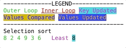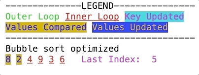 Below you can see animated gifs depicting inner workings of three N squared sorting algorithms, Bubble sort, Insertion sort and Selection sort. On top of each gif, there is a legend explaining how to read different font colors and background colors in the the output.