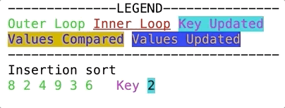 Besides loops, values being compared are depicted by yellow background color, and values being updated are shown by blue background color. Each algorithm also has a specific key, that is tracks, it’s represented in purple font color. Keys are usually updated with each iteration of outer loop.